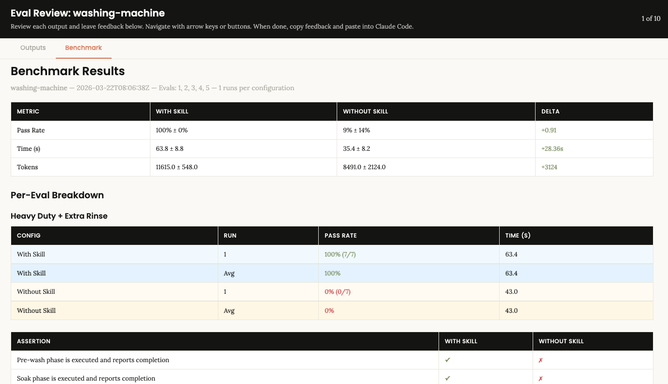 If you look at the aggregated result summary Claude wrote out for this skill, you'll see that without the skill, Claude doesn't make a great agentic washing machine. But with the skill, Claude can handle the task 100% of the time.