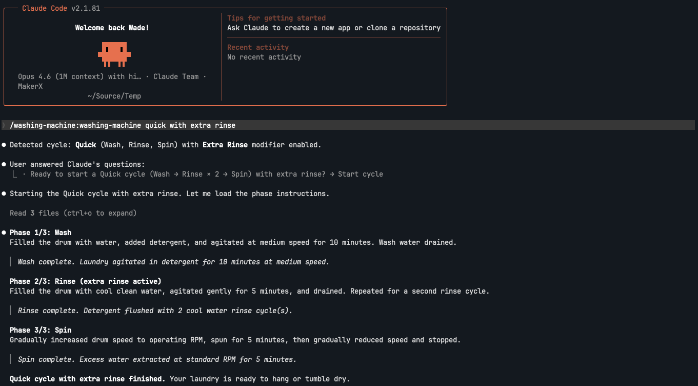 /plugin install washing-machine@blog-skill-examplesThen restart Claude Code. And when you're done, remove it with: