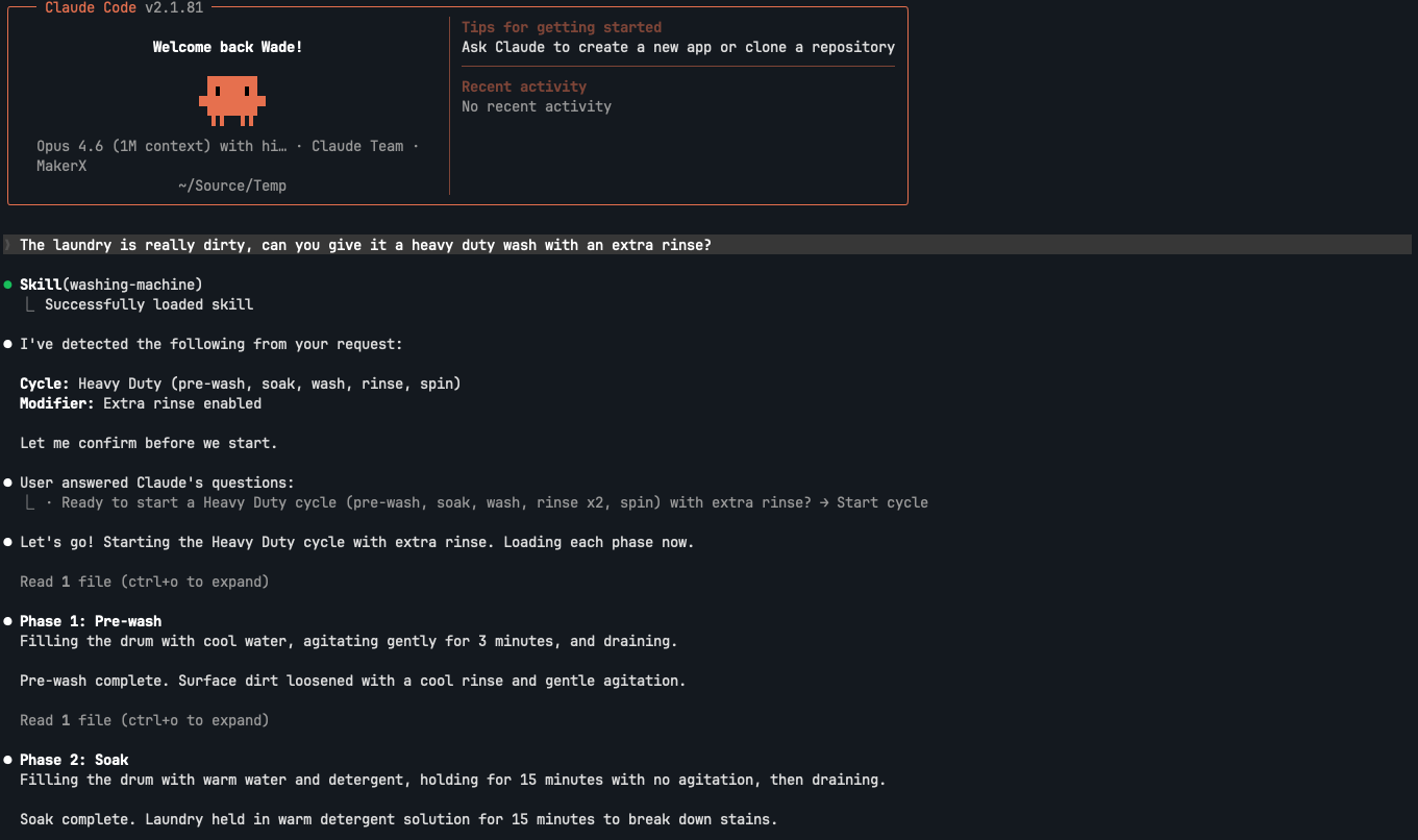 What is the agentic washing machine? It's a reference skill that demonstrates a pattern for building a CLI-like interface that accepts natural language input to perform a task. It works well by directly slash-activating /the-skill or through context activation, where the AI itself must decide to activate it.