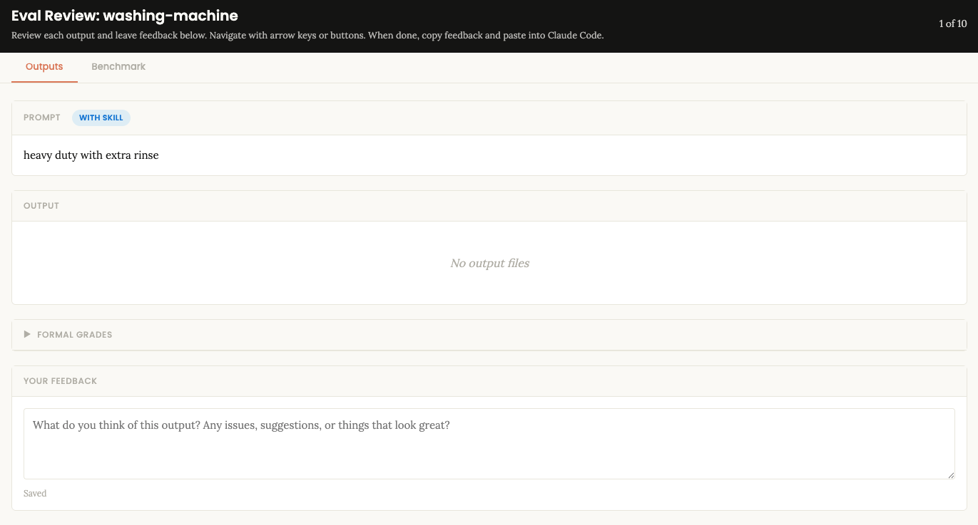 /skill-creator run evals for the washing-machine skillThis spawns a subagent for each eval that executes the prompt with the skill loaded, then grades the output against the expectations. The skill-creator also runs baseline comparisons (the same prompts without the skill) to measure the value the skill adds.